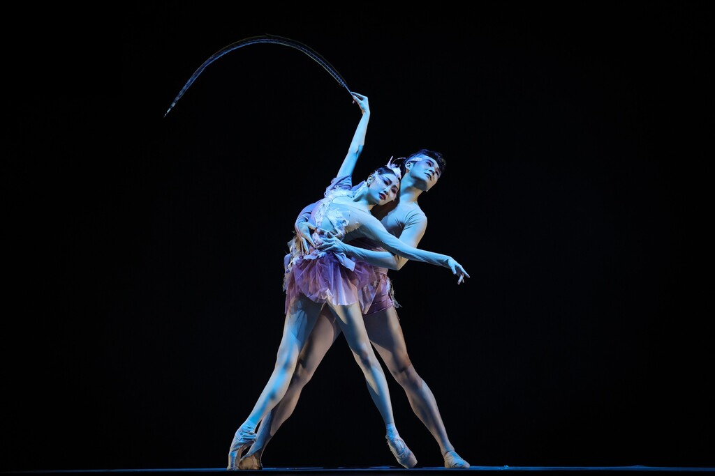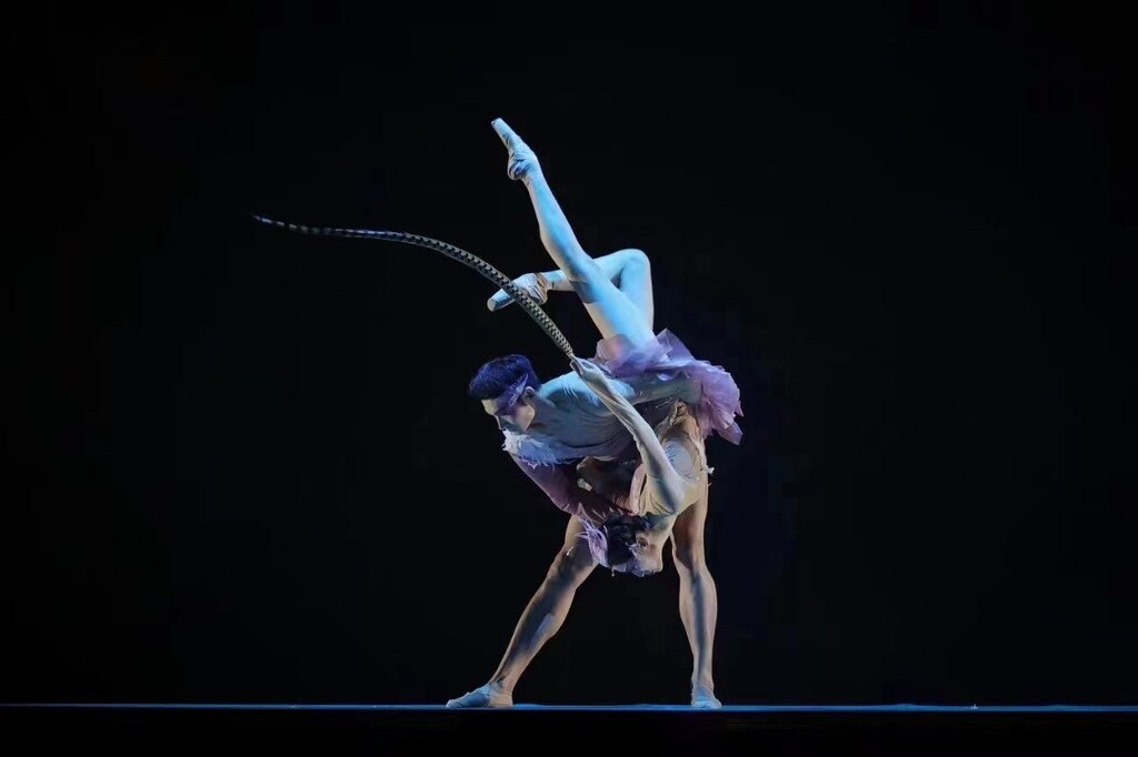 双人舞《惊鸿》以芭蕾舞呈现鸿雁在山水间自由翩跹的灵动形象,舞姿轻盈飘逸又柔美自如,呈现出自然万物和谐共处的美好画面。舞蹈将山川自然、草木生灵与芭蕾有机融合,贯穿“尊重自然、顺应自然、保护自然”的理念,表达对重庆建设成为天更蓝、地更绿、水更清、空气更清新的“山水之城·美丽之地”的无限期待。